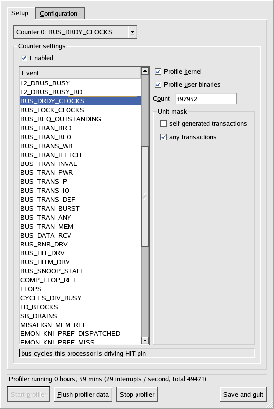 On the Setup tab, to set events for the processor counters as discussed in Section 43.2.2 Setting Events to Monitor, select the counter from the pulldown menu and select the event from the list. A brief description of the event appears in the text box below the list. Only events available for the specific counter and the specific architecture are displayed. The interface also displays whether or not the profiler is running and some brief statistics about it.