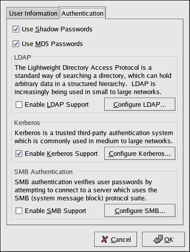 The krb5-libs and krb5-workstation packages must be installed for this option to work. Refer to the Red Hat Enterprise Linux Reference Guide for more information on Kerberos.