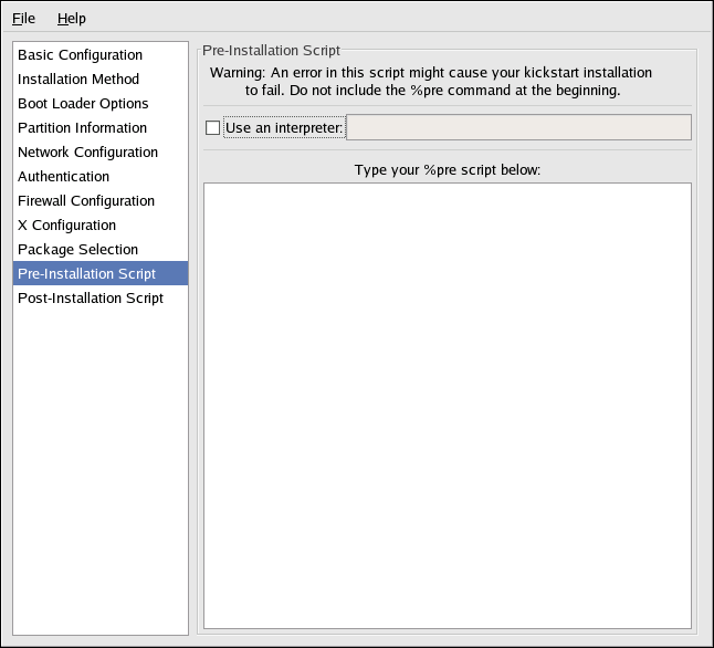 To specify a scripting language to use to execute the script, select the Use an interpreter option and enter the interpreter in the text box beside it. For example, /usr/bin/python2.2 can be specified for a Python script. This option corresponds to using %pre --interpreter /usr/bin/python2.2 in your kickstart file.