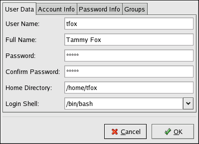• User Data — Shows the basic user information configured when you added the user. Use this tab to change the user's full name, password, home directory, or login shell.