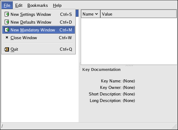 When logged in as root, you can use GConf editor to set system-wide default and system-wide mandatory settings by opening a special GConf editor window. For example, to set mandatory system-wide settings, run GConf editor and choose New Mandatory Window from the File menu as shown in Figure 1-2.