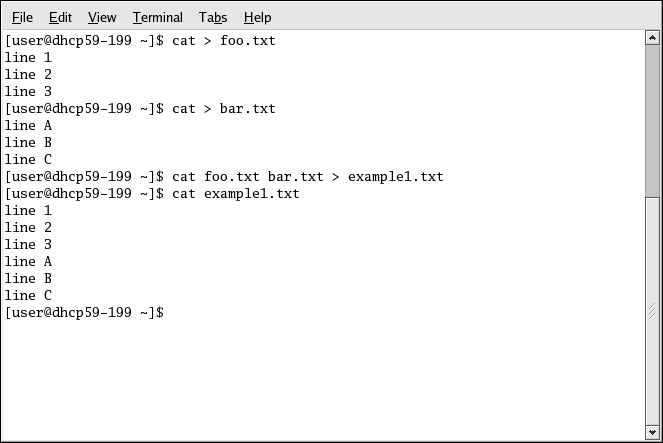 The following screen demonstrates cat's concatenate function, adding the contents of bar.txt to the end of foo.txt. Without redirection to the file example1.txt, cat displays the concatenated contents of foo.txt and bar.txt on the screen.